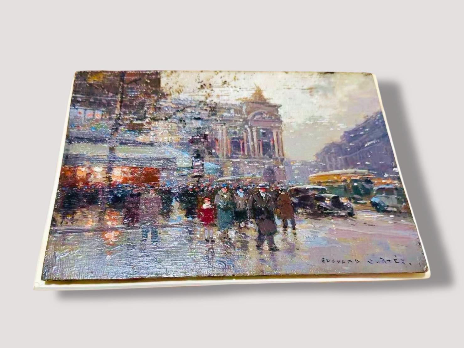 技法:油彩・板 作者:エドゥアール=レオン・コルテス エドゥアール=レオン・コルテスによる板絵油彩作品でございます。 コルテスは、パリの街景を描いた画家として知られ、詩情あふれる都市風景表現により高い評価を受けています。 本作は小品ながらも、油彩ならではの豊かな色彩と筆致が凝縮されており、街の空気感や光の移ろいが巧みに表現されています。 板に描かれているため絵肌が安定しており、密度の高い画面構成も魅力のひとつです。 画面には作家のサインが確認でき、コルテス作品としての価値を裏付けています。 コレクション性が高く、空間にさりげなく彩りを添える一作でございます。