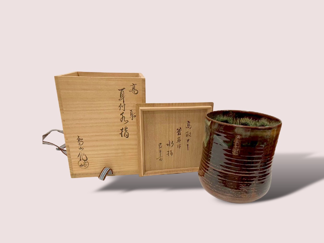 【作者】鬼丸雪山 【窯元】高取焼 【作品】耳付水指 【サイズ】H18.3 × W14.8cm 【銘】底部に印銘「髙取・雪山」/蓋に描き銘「宗恵」 【付属】尋牛斎書付・在判・共箱 本作は、鬼丸雪山による高取焼の耳付水指でございます。 高取焼は、小堀遠州の美意識を背景に発展した「遠州七窯」の一つとして知られ、上品で洗練された意匠が特徴です。本作においても、端正な耳付の造形と落ち着いた釉調が調和し、気品ある佇まいを見せております。 また、蓋には「宗恵」の銘が描かれ、さらに尋牛斎による書付が添えられており、茶道具としての格調の高さを一層引き立てています。 底部には「髙取・雪山」の印銘が確認でき、在判・共箱も揃った、保存状態・資料性ともに優れた逸品でございます。
