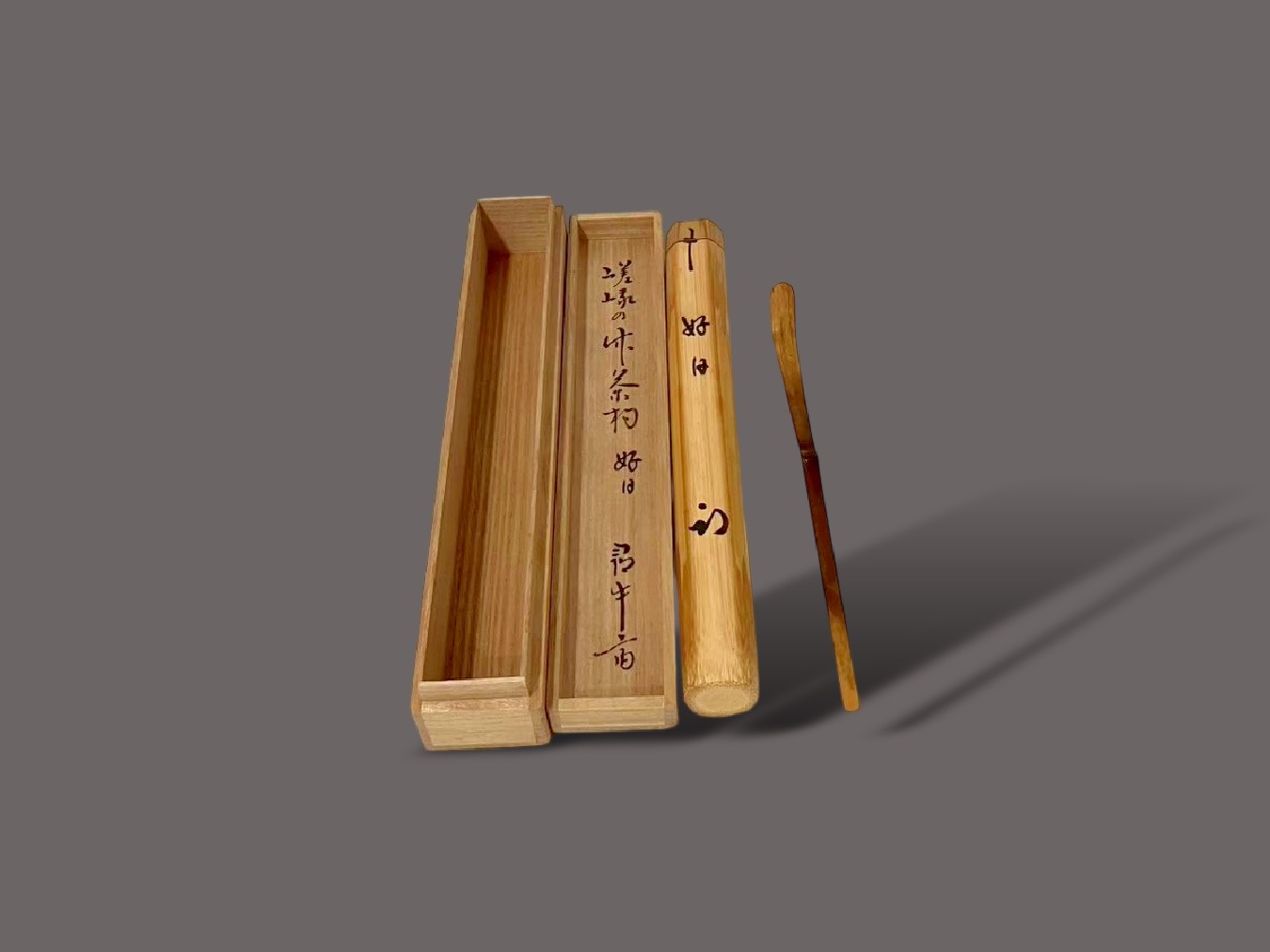【作者】尋牛斎 【作品】嵯峨の竹茶杓 「好日」 【サイズ】L18.2cm 【銘】好日 【下削】石崎芦流 【付属】共箱・共筒 本作は、尋牛斎の御好による嵯峨竹茶杓、「好日」でございます。 「好日」とは、日々是好日という禅語にも通じる言葉で、日常の一日一日を大切にする茶の湯の精神を象徴する銘として知られております。本作においても、その穏やかで格調ある趣が感じられます。 材には風雅な趣をもつ嵯峨の竹が用いられ、自然の節や曲がりを活かした美しい造形が魅力です。下削は石崎芦流によるもので、確かな技術に裏打ちされた繊細な仕上がりとなっております。 共箱・共筒が揃っており、保存状態・資料性ともに優れた、茶席において格を添える一品でございます。